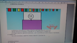 Desenho no programa de pintura, inserção no editor de texto, produção textual com título, frases, parágrafos e pontuação.