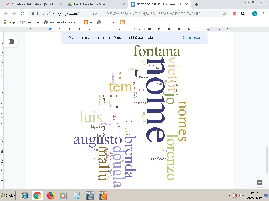 Cada aluno digitou seu nome num texto docs e criamos uma nuvem de palavras.